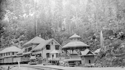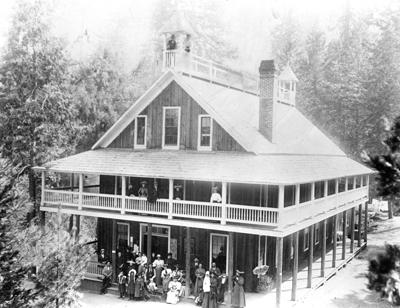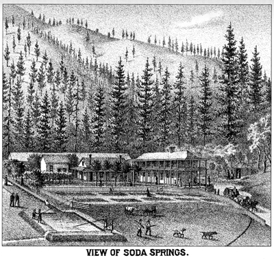 South County Mineral Spring Resorts Lower Soda Springs and Castle Rock (north Shasta County) Yet business was brisk enough to warrant building hotels at both Upper and Lower Soda Springs. A man named George Washington Bailey, a former miner from Yreka and purportedly an invalid for four years, bought the Lower Soda Springs property, drank the water, regained his health and in 1858, built a modest inn at the stage stop. 24 years later, with railroad construction slowly working its way north, he sold out to the Pacific Improvement Company, the subsidiary of the Southern Pacific Railroad that established towns and built hotels all along its rail lines. In 1891 PIC constructed the considerably more upscale Tavern of the Crag. It had 250 rooms, a dining room that could seat 350 and “all of the most modern conveniences.” The three-story hotel burned after being struck by lightning just nine years later although other buildings, such as railroad baron Charles Crocker’s summer house, survived and it continued to operate haphazardly as a resort for the next three decades. Still called the Berry Estate after the San Francisco millionaire who purchased it in 1930 (there have been several owners since Berry), there is no public access, although the gazebo shielding the soda spring is visible when driving on Riverside Road.