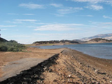 | At the bottom of the grade the old road now drops into Emigrant Lake which covers the townsite of Klamath Junction. GO TO a larger photo. |